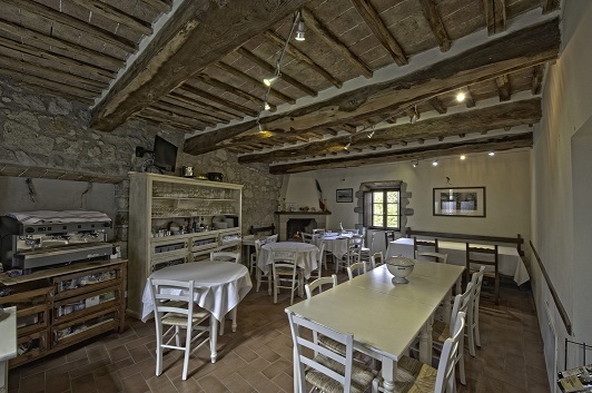All'interno della sala, il calore del caminetto e i pochi posti a sedere rendono l'atmosfera accogliente e confortevole.